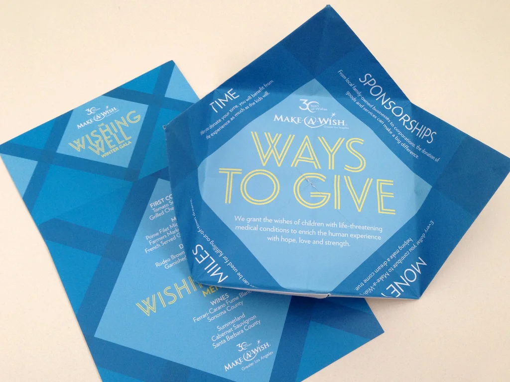 An origami invitation for the Make A Wish Foundation gala fundraising event. The invitation was made to fold out and show different ways to donate.